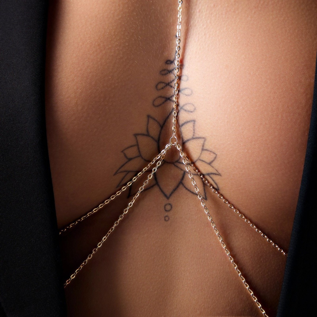 Оригинальная цепочка на грудь выполнена из тонкого металла в виде тоненьких колечек и соединена таким образом, чтобы подчеркнуть зону декольте.