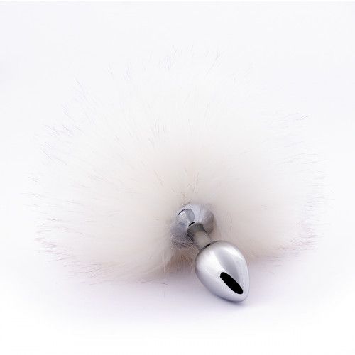 Серебристая анальная пробка с белым хвостиком. Искусственный эко-мех. Диаметр хвоста — 15 см.